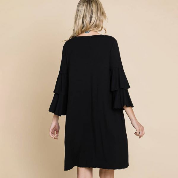 Sivutaskut. Puolipitkät röyhelöiset hihat.