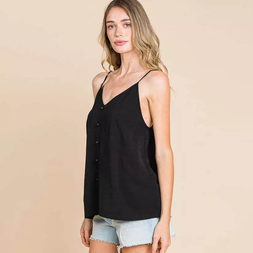 Kevyesti A-linjainen selästä avoin camitoppi. Kapeat säädettävät olkaimet.