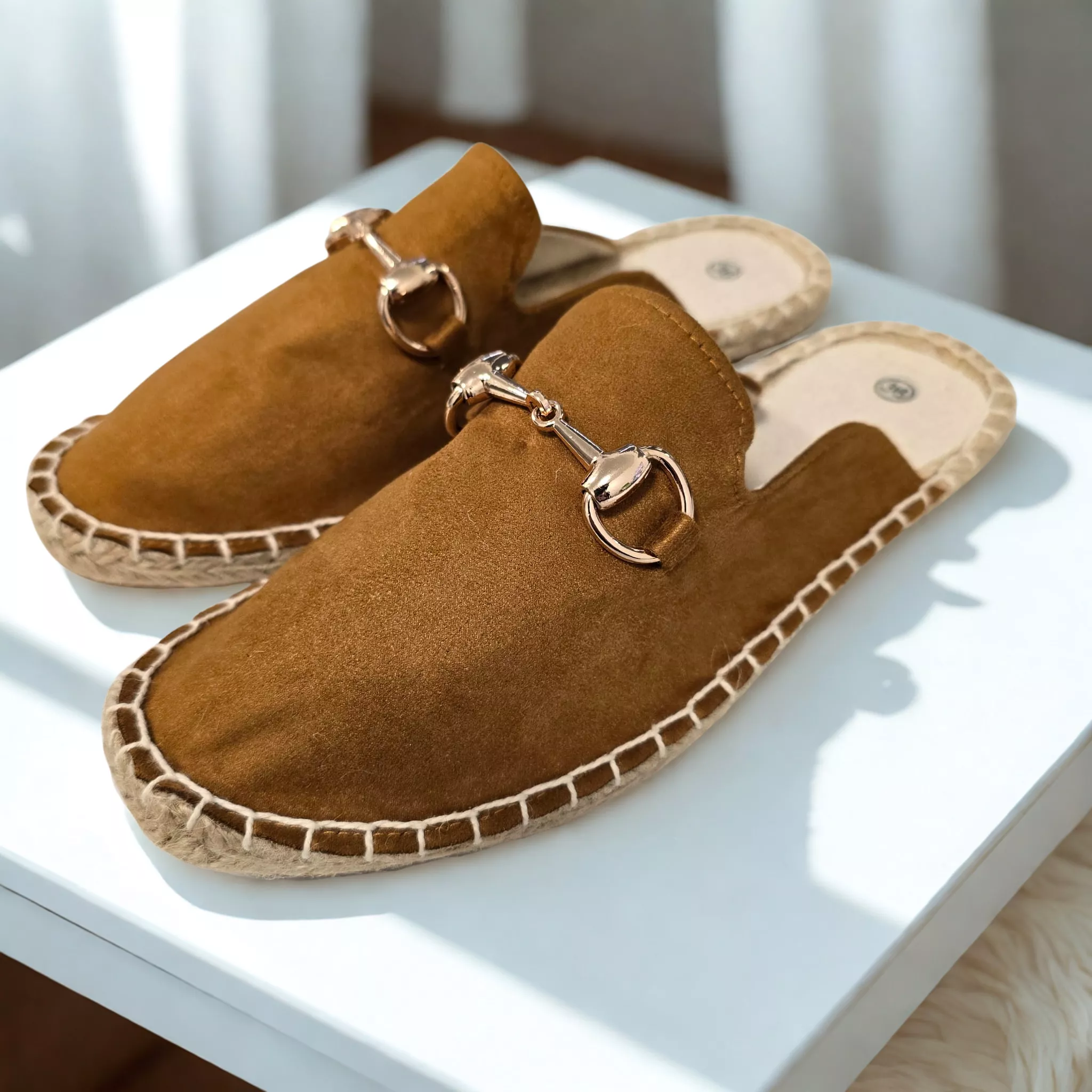 Matalakantaiset kumipohjaiset pistokkaat. Kullanvärinen koru edessä.