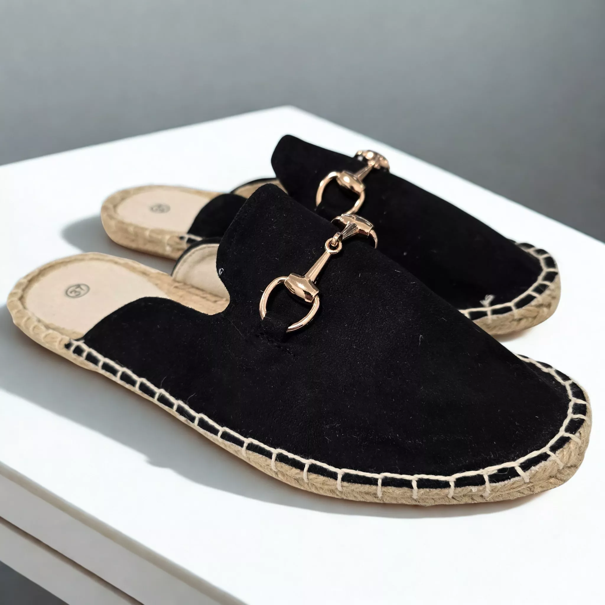 Matalakantaiset kumipohjaiset pistokkaat. Kullanvärinen koru edessä.