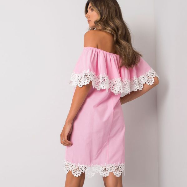 Vilpoisa ja kevyt, pirteän värinen puuvillamekko. Yläosassa ja helmassa pitsisomisteet.