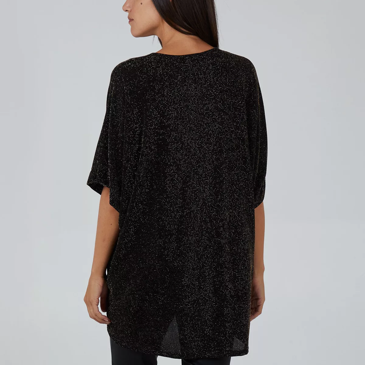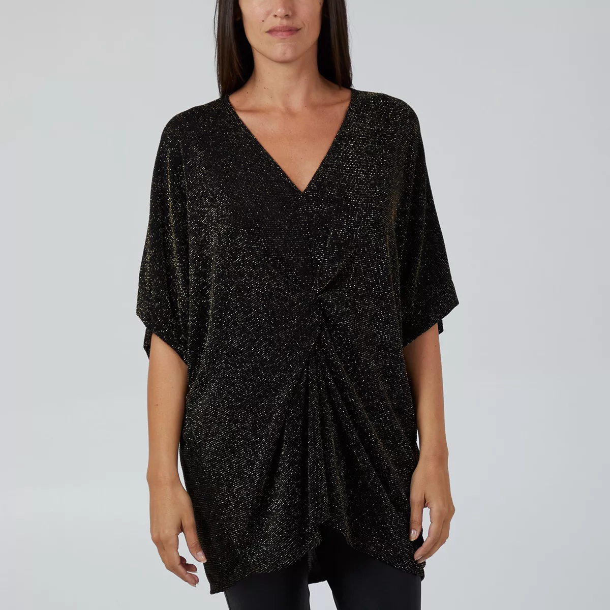 Kimaltava paita puolipitkillä hihoilla. Etuosassa solmuefekti.