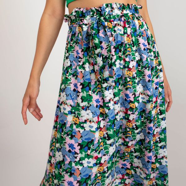 Näyttävä kukkakuvioinen hame voimakkaasti levenevällä helmalla.