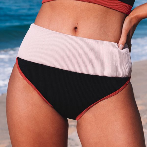 Kokonaanvuoratut ribatut bikinit ja korkeavyötäröiset bikinihousut.