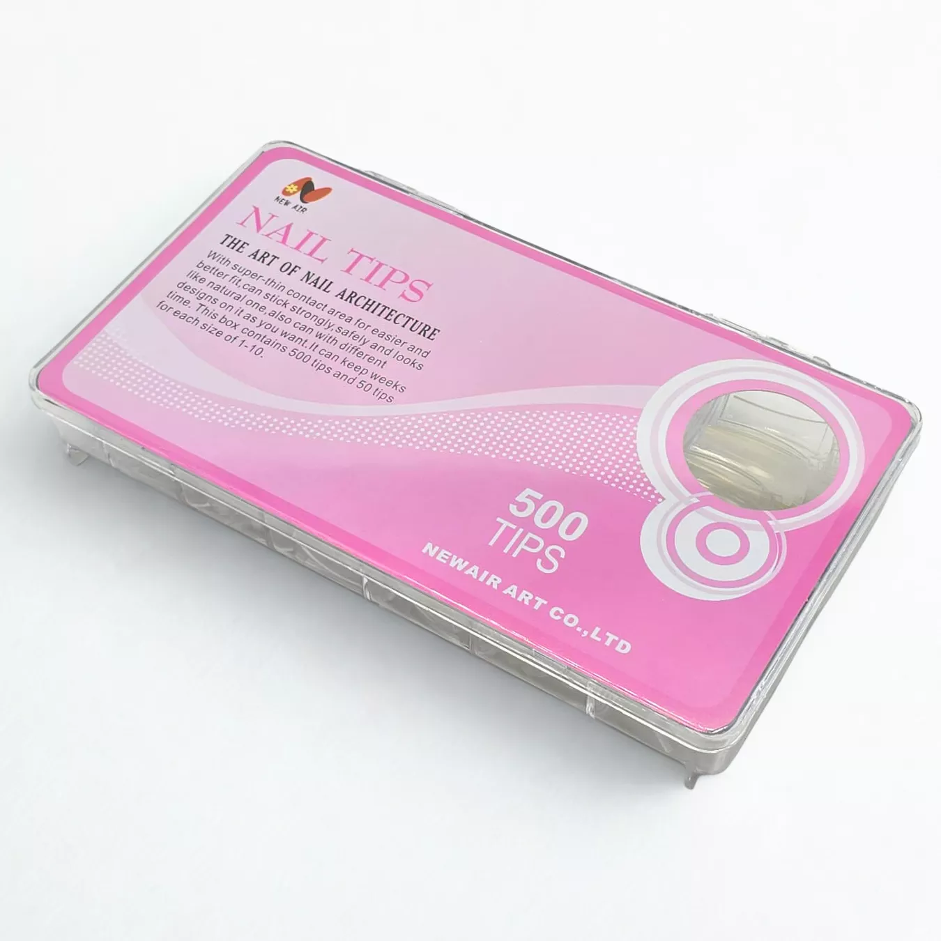 500 kpl pakkaus kirkkaita puolenkynnen kynsitippejä kätevässä muovirasiassa.