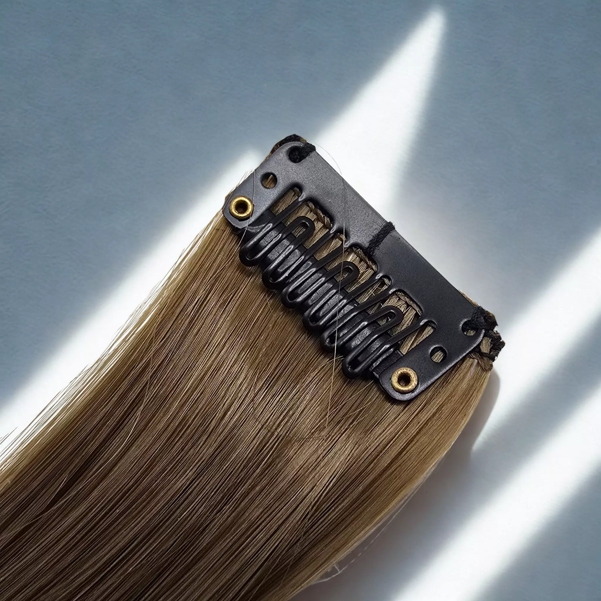 Lisäke kiinnitetään omiin hiuksiin kiinni klipsillä tekemällä omiin hiuksiin jakaus ja lisäke kiinnitetään jakauksen alapuolelle. Omat hiukset tulee klipsin päälle eikä klipsi näy niiden alta.