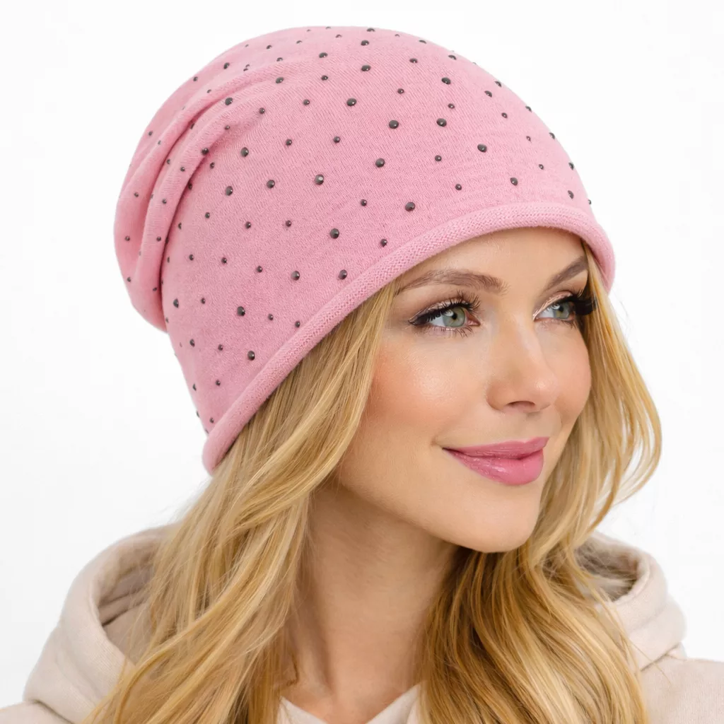 Ihastuttava hematiitin värisin strassein koristeltu puuvillainen trikoopipo. Pitkä malli.