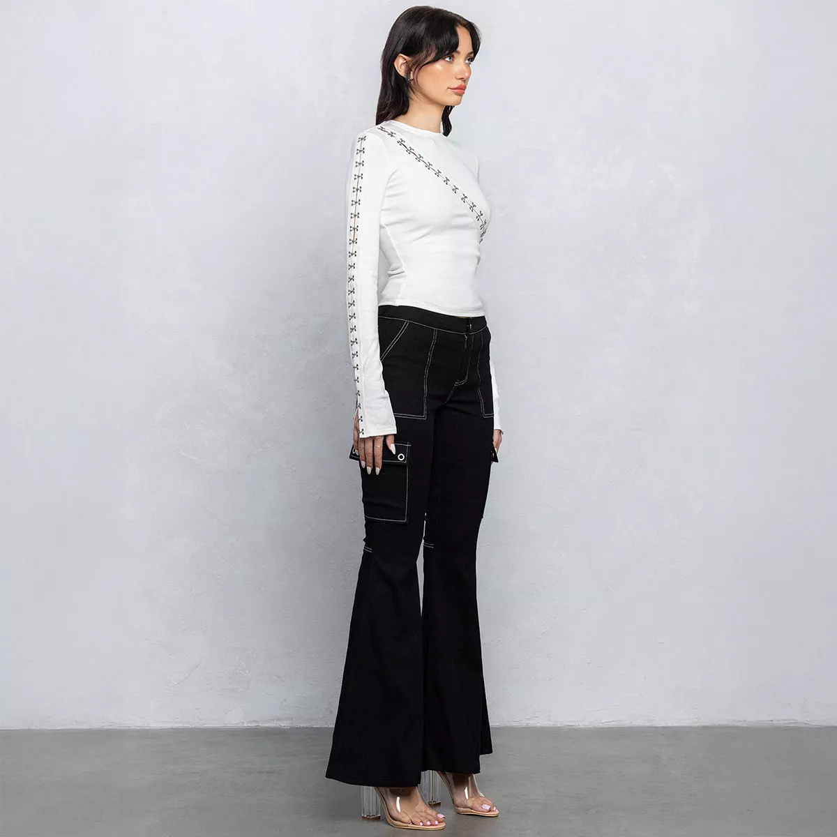 Näyttävät ja persoonalliset mustat leveälahkeiset farkut, joissa yhdistyvät 2000-luvun alun tyyli ja nykyaikainen käytännöllisyys. Hiukan joustavasta stretchdenimistä valmistetuissa housuissa on matala vyötärö, korostetut valkoiset koristetikkaukset sekä monipuoliset taskut – kaksi takataskua, sivutaskut sekä reisitaskut. Klassinen nappi- ja vetoketjukiinnitys. Ei vyönlenkkejä. Täydellinen valinta, kun haluat erottua ja yhdistää katu-uskottavan tyylin naiselliseen siluettiin.
