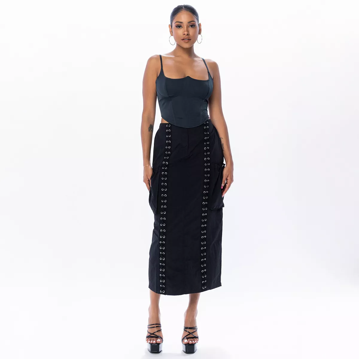Tyylikäs ja urbaanin trendikäs midipituinen hame, joka erottuu yksityiskohdillaan. Hameen etuosassa on näyttävät koristeremmit nyörityksillä ja nappikiinnitys läpän alla. Vyötärön takaosassa on kuminauharesori, joka tuo lisämukavuutta. Sivuilla suuret, näyttävät taskut, joissa kuminauhasuljenta ja kiristyslukot. Takana halkio helpottamassa liikkumista. Valmistettu kevyestä, tuulenpitävästä 100% polyesterikankaasta, joka ei jousta.