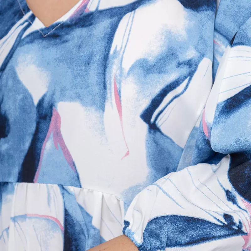 Kaunis sinisävyinen kuviointi. 3/4-hihat joiden suissa kuminauha.